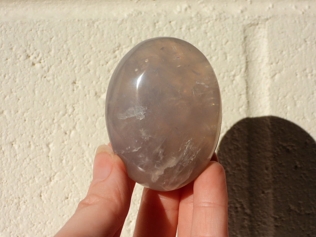 This Blue Rose Quartz palm stone is stunning! The colour is so gorgeous, with varying shades of blue and grey. In the right light you can also see a hint of pink peeking through as well as the beautiful shine and rainbows.
