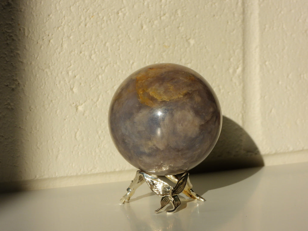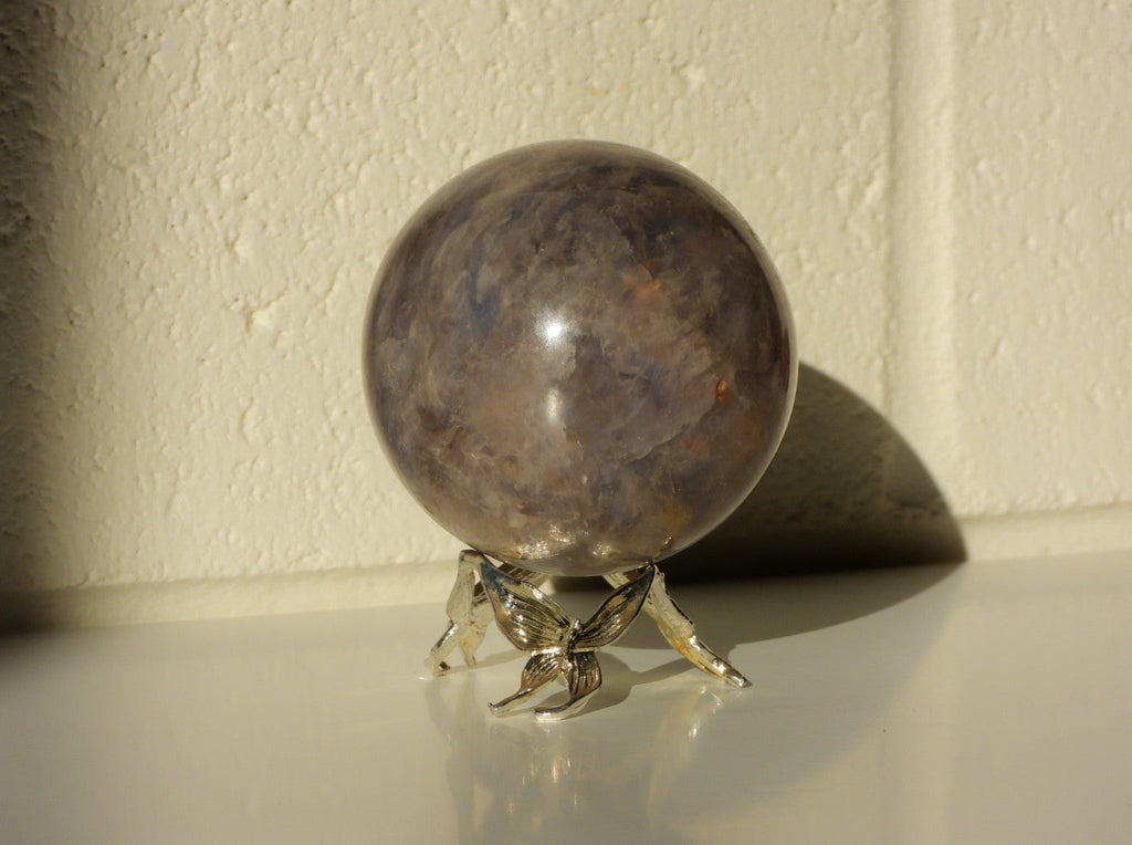 This Blue Rose Quartz sphere is stunning! The colour is so gorgeous, with varying shades of blue and grey. In the right light you can also see a hint of pink peeking through as well as the beautiful shine and rainbows.