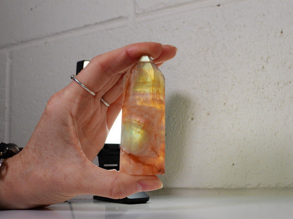 This Fluorite and Fire Quartz tower is so gorgeous. It is quite light in colour, with lovely swirls of that classic Fire Quartz orangey red and some purple banding. The patterning on this tower is really unique, it's amazing how it completely changes in different lighting and also has some rainbows!