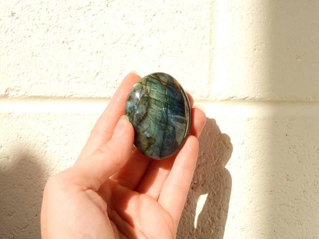 This small Labradorite palm stone has great colour and flash to it. It also has shimmer and some rainbows! The way it changes in different lighting and held on different angles is so amazing and unique.